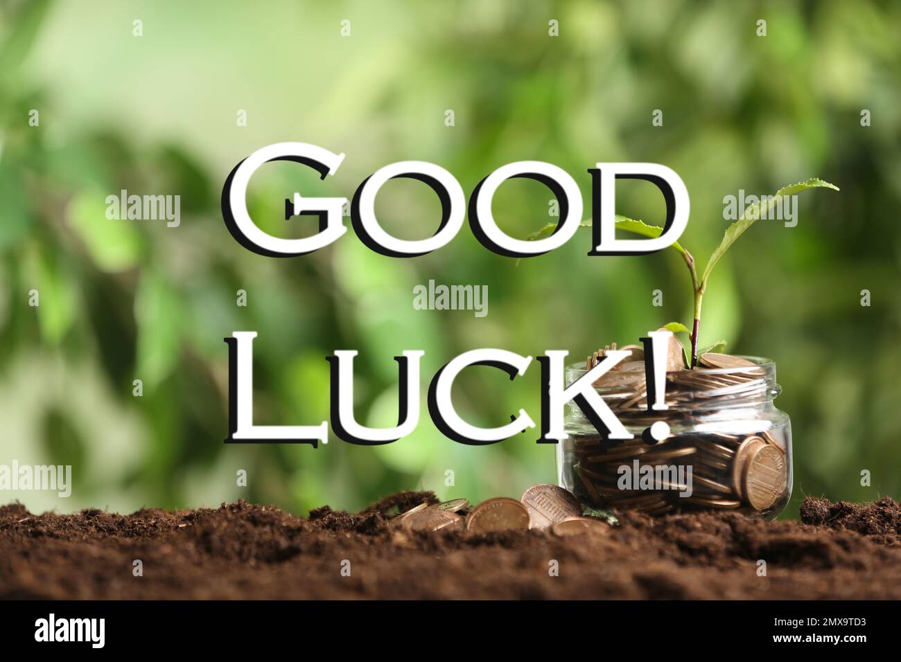 Coins with green plant and phrase GOOD LUCK on blurred green